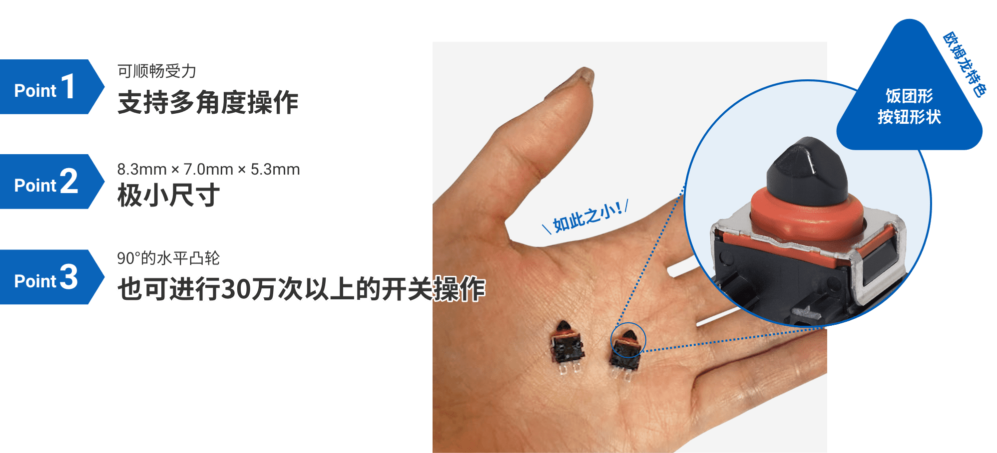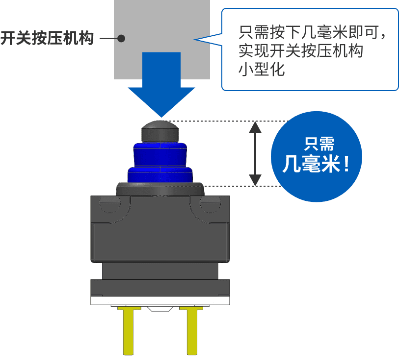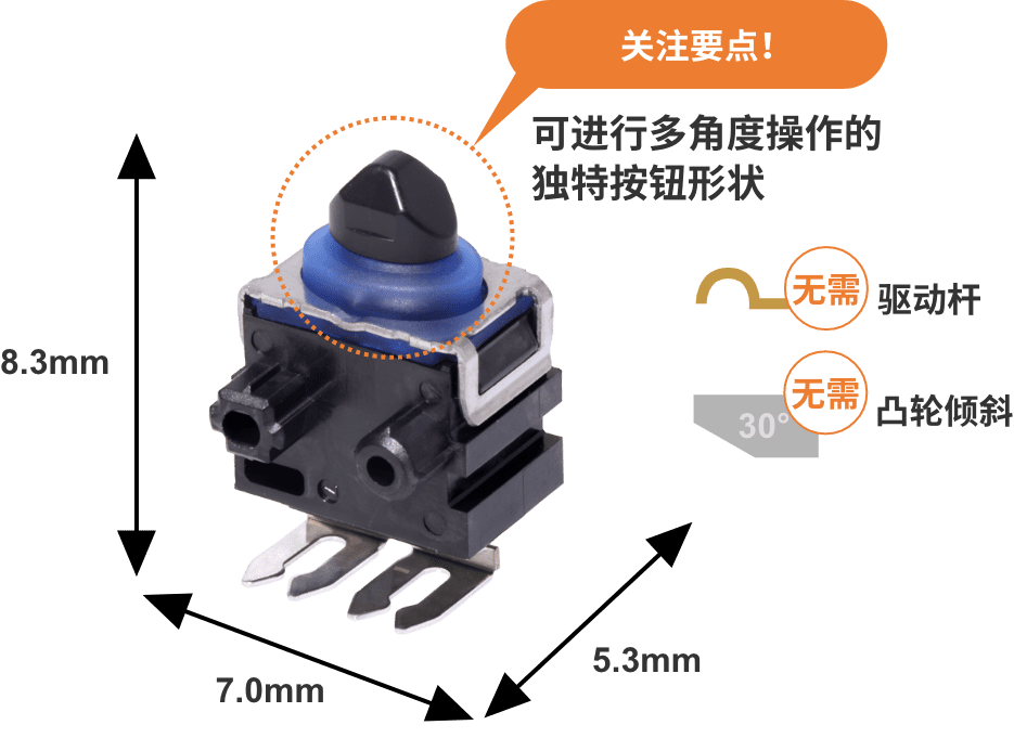 實現(xiàn)(1)和(2)最簡單的方法就是從正上方按壓,也就是從行程(完全按下開關的距離)最短的角度按壓。但要設計行程只有幾毫米的超微小型開關的垂直按壓并不容易。