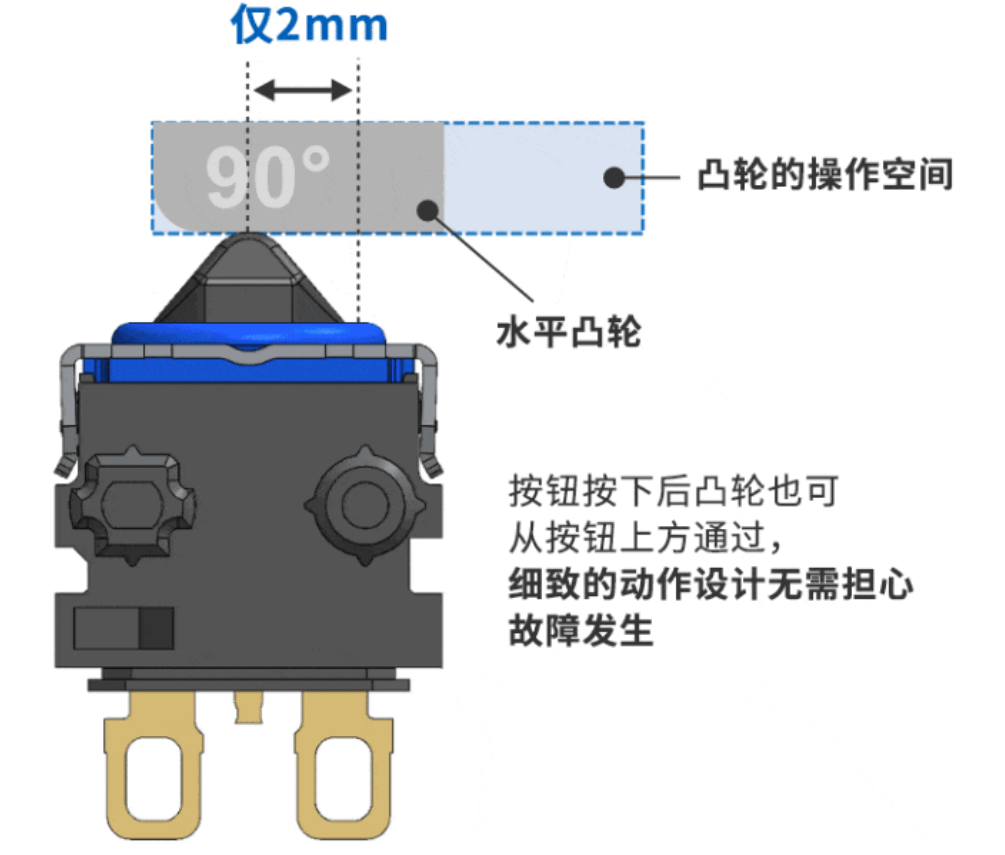 由于無驅動桿,水平凸輪只需最小的移動即可完全按下按鈕,因此有助于節(jié)省空間。